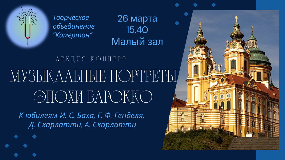 26 марта 15.40 в Малом зале колледжа состоится лекция-концерт "Музыкальные портреты эпохи барокко" в рамках работы творческого объединения "Камертон".