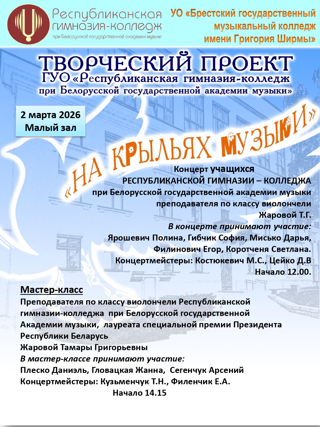 2 марта 2026 года в 12.00 в Малом зале состоится творческая встреча с преподавателем по классу виолончели Республиканской гимназии-колледжа при БГАМ, лауреатом специальной премии Президента Республики Беларусь Жаровой Тамарой Григорьевной и её учениками.