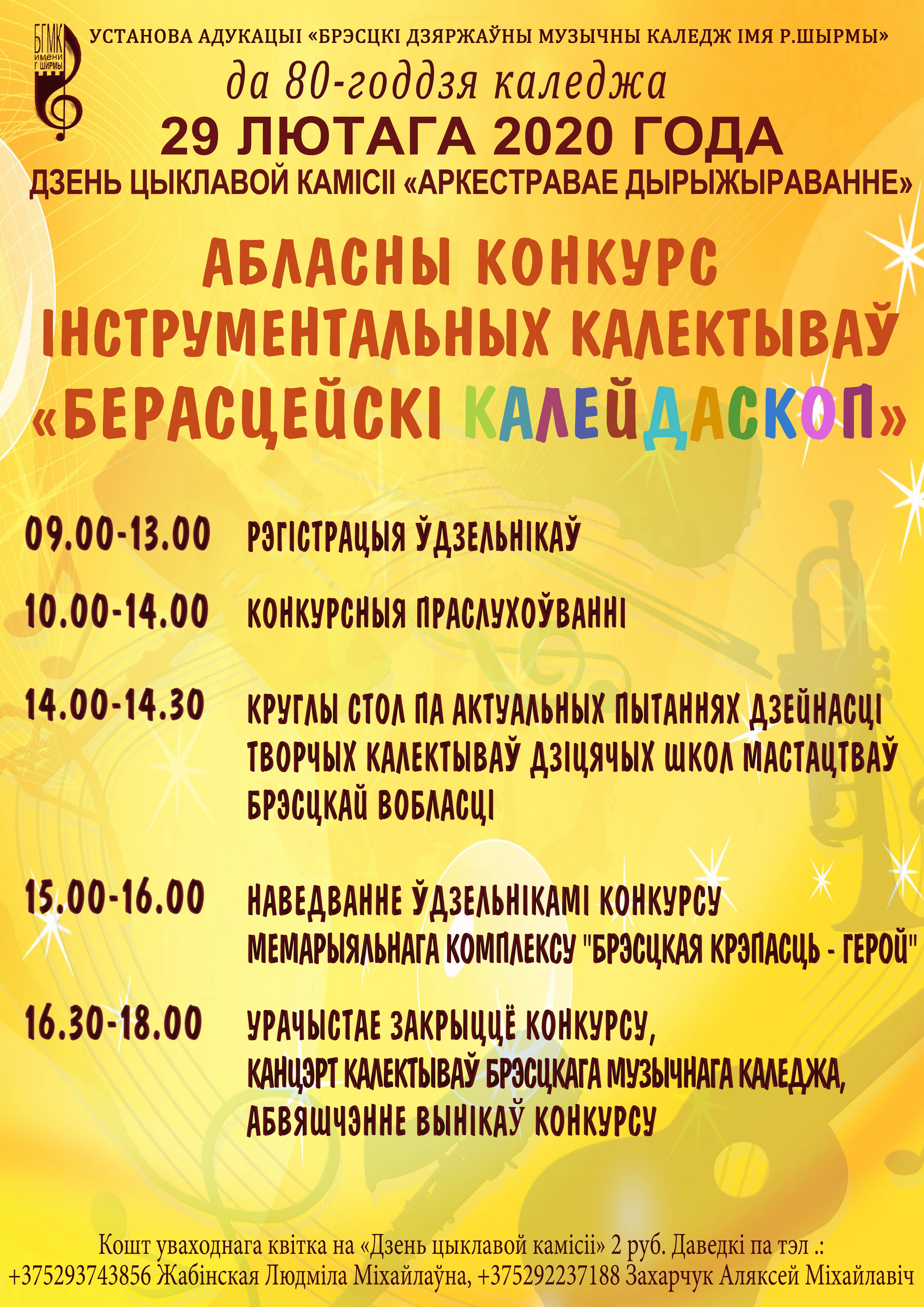 29 февраля 2020 года в Брестском музыкальном колледже в рамках Дня цикловой комиссии "Оркестровое дирижирование" состоится областной конкурс инструментальных коллективов "Берасцейскі калейдаскоп"
