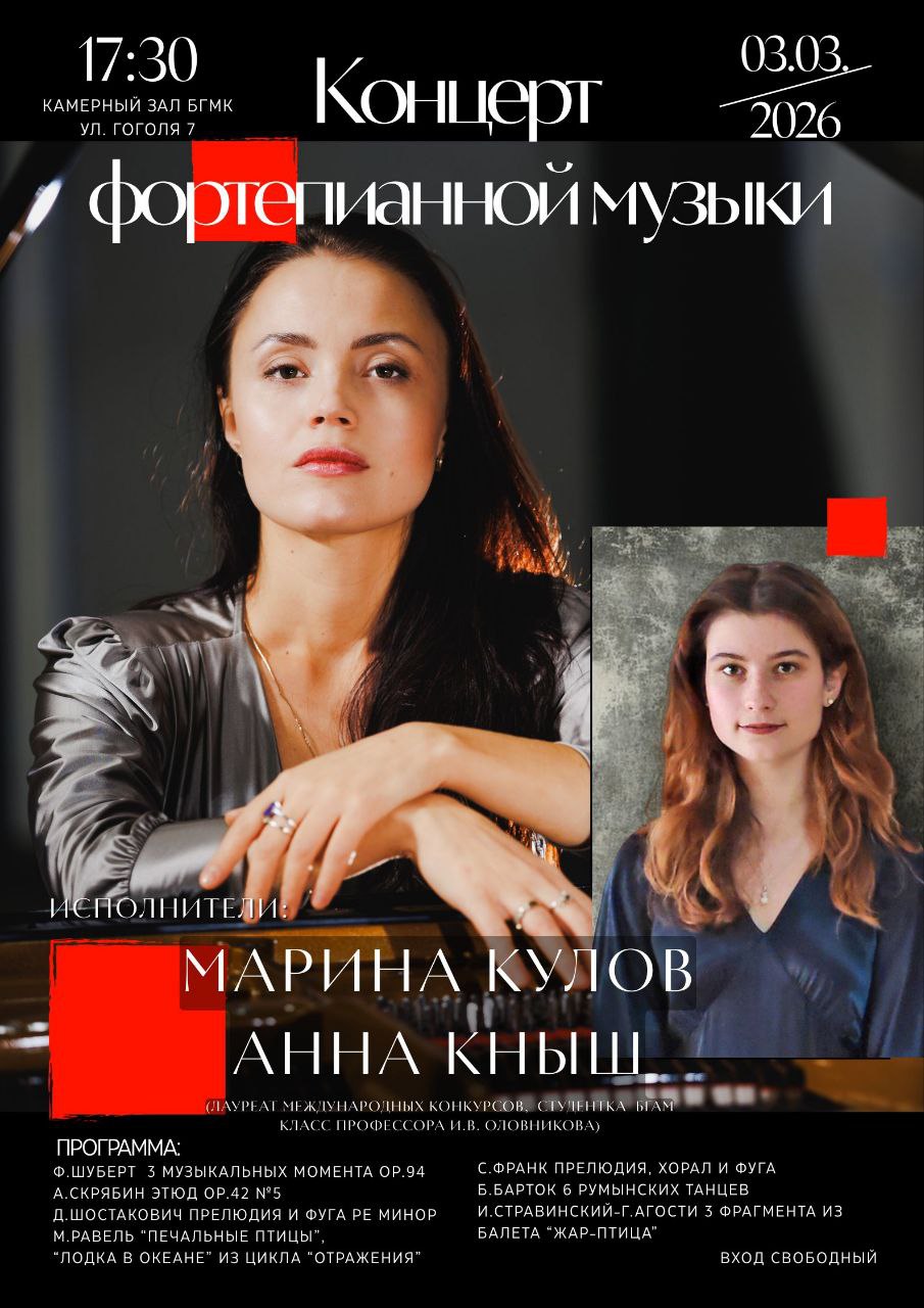 3 марта 2026 года в 17:00 состоится концерт фортепианной музыки. На сцене Камерного зала выступят лауреаты международных конкурсов Марина Кулов и Анна Кныш. В программе прозвучат произведения русских и зарубежных композиторов.