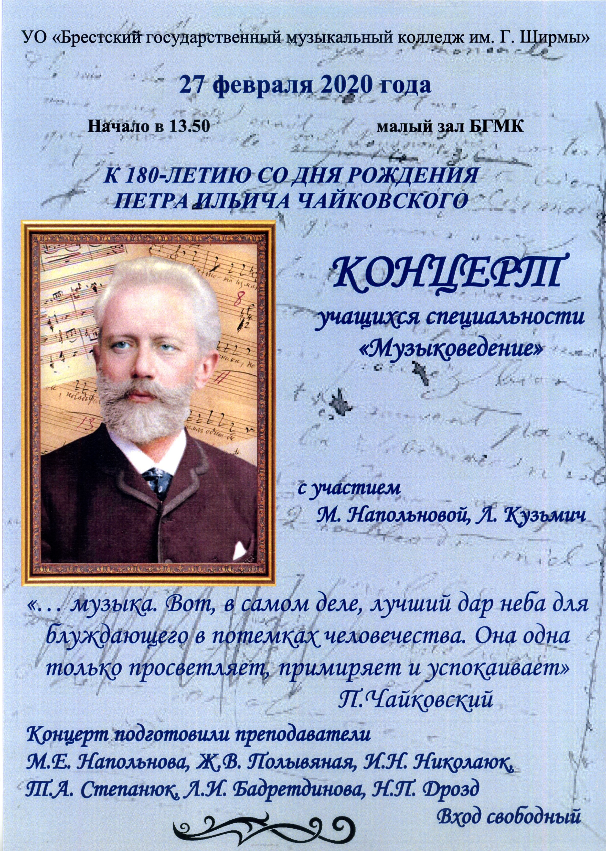 27 февраля 2020 года в малом зале колледжа состоится Концерт-лекция к 180-летию со дня рождения П.И. Чайковского