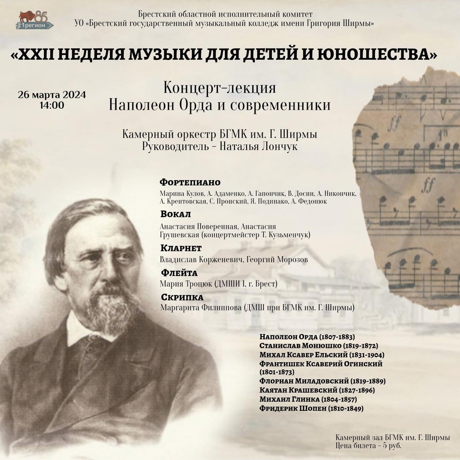 26 марта 2024 года в 14.00 в Камерном зале в рамках XХII Недели музыки для детей и юношества состоится концерт-лекция «НАПОЛЕОН ОРДА И СОВРЕМЕННИКИ», в котором примут участие учащиеся колледжа и ДМШИ г. Бреста, также камерный оркестр колледжа (художественный руководитель и дирижер – Наталья Ланчук)
