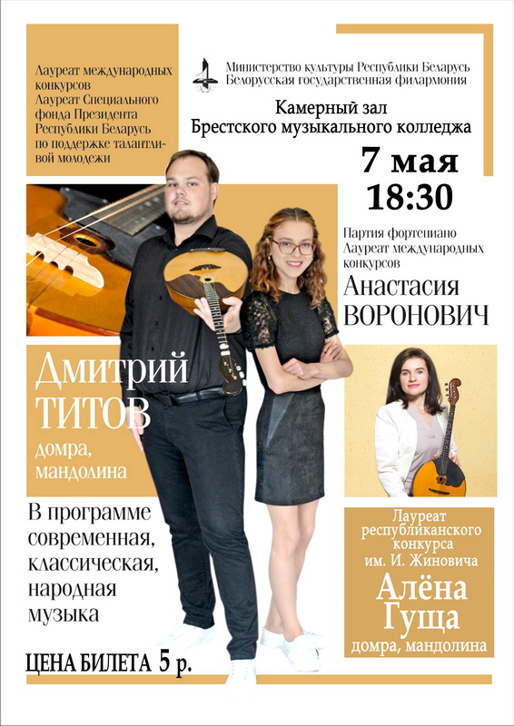 7 мая 2021 года в 18.30 в камерном зале Брестского музыкального колледжа имени Григория Ширмы состоится концерт исполнителей на струнных народных инструментах лауреата международных конкурсов, лауреата Специального фонда Президента Республики Беларусь по поддержке талантливой молодежи ДМИТРИЯ ТИТОВА (домра, мандолина), лауреата республиканского конкурса им. И. Жиновича АЛЁНЫ ГУЩИ (домра, мандолина).