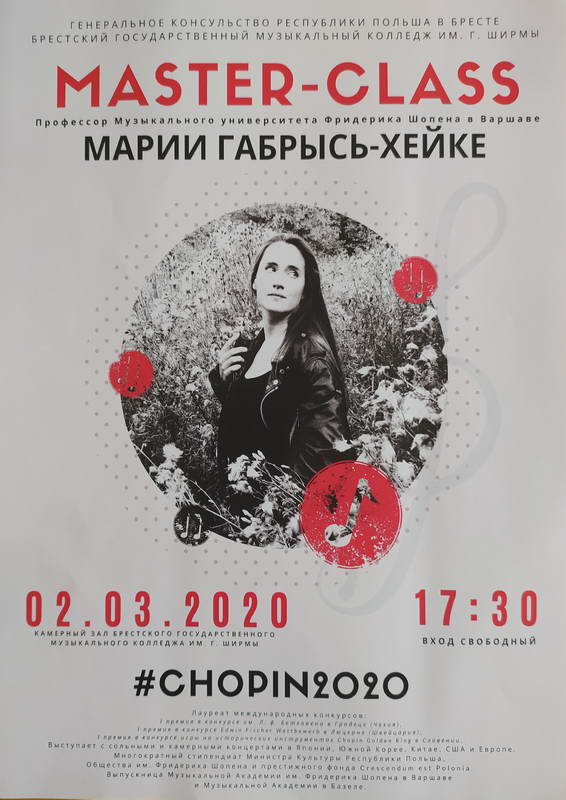2 марта 2020 года в Камерном зале Брестского музыкального колледжа состоится мастер-класс лауреата международных конкурсов, многократного стипендиата Министра культуры Республики Польша, Общества им. Фридерика Шопена и престижного фонда Crescendum est Polonia, выпускницы Музыкальной академии им. Фридерика Шопена и Музыкальной академии в Базеле, профессора Музыкального университета им. Фридерика Шопена (Варшава) Марии Габрысь-Хейке.