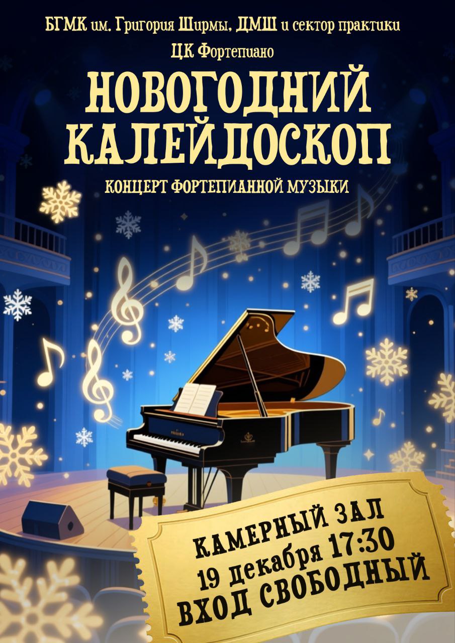 19 декабря 2025 года в 17:30 в Камерном зале состоится фортепианный концерт "Новогодний калейдоскоп", в котором примут участие учащиеся Детской музыкальной школы и Центра практики при колледже. Вход свободный.