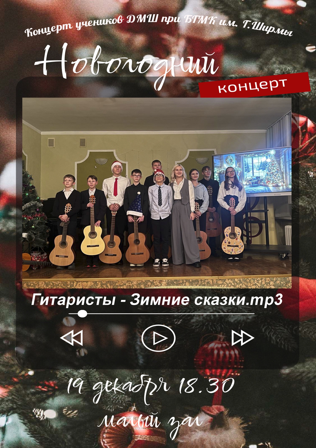 19 декабря 2025 года в 18:30 в Малом зале состоится Новогодний концерт учащихся ДМШ класса гитары. Вход свободный.