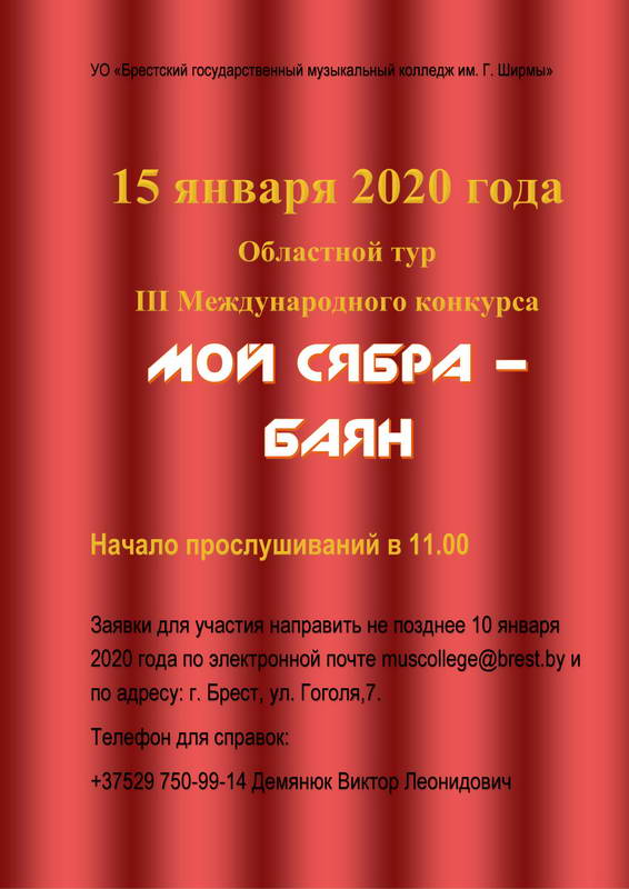15 января 2020 года на базе учреждения образования "Брестский музыкальный колледж им. Г. Ширмы" состоится областной тур ІІІ Международного конкурса "Мой сябра - баян". Заявки для участия в отборочном туре направить не позднее 10 января 2020 года по электронной почте Адрес электронной почты защищен от спам-ботов. Для просмотра адреса в вашем браузере должен быть включен Javascript. и по адресу: г. Брест, ул. Гоголя, 7.